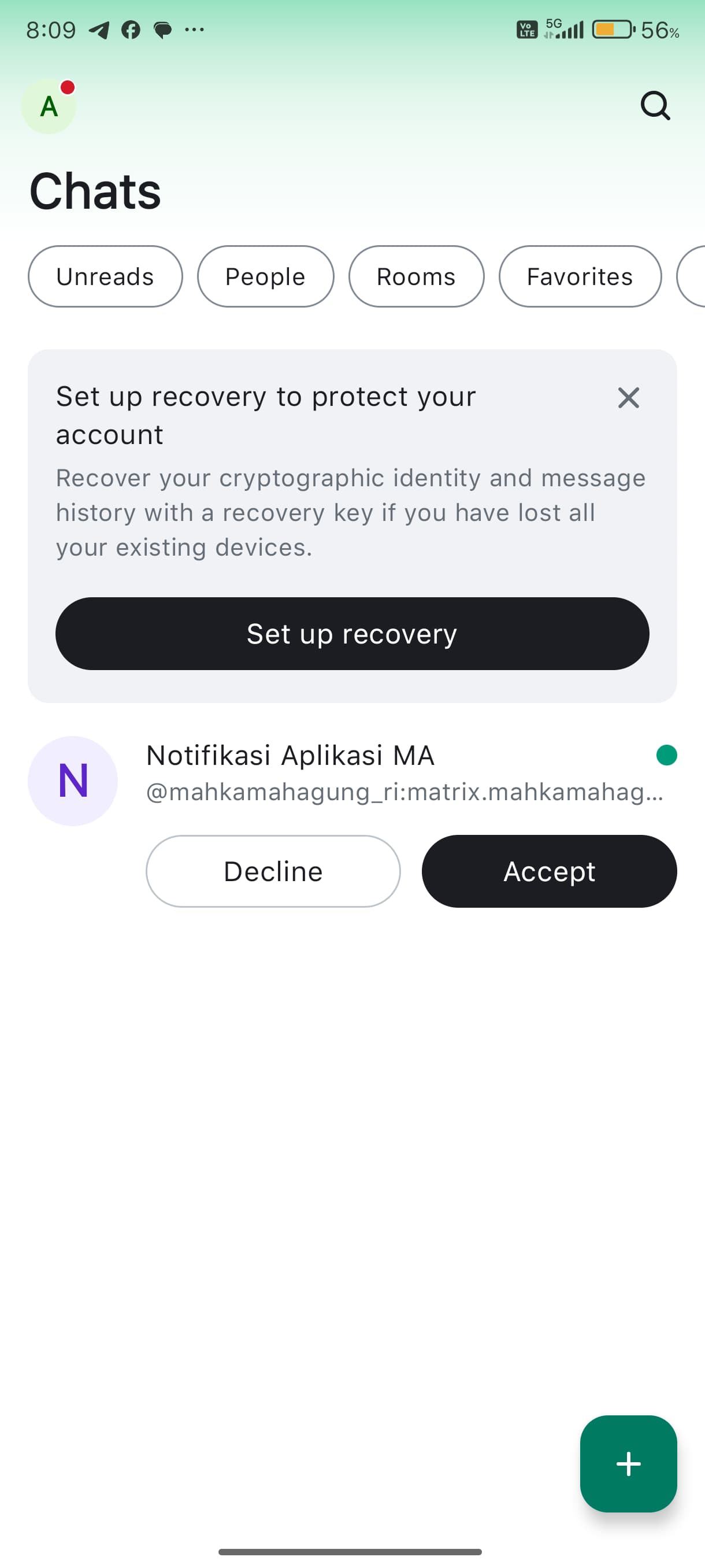 7. Setelah berhasil login , silahkan accept chat dari Bot Mahkamah Agung untuk menerima notifikasi. Notifikasi akan selalu dikirimkan melalui percakapan atau room tersebut . Jangan Leave Room atau Block user bot mahkamahagung_ri ! . Terakhir, Set up recovery (opsional, jika dibutuhkan agar percakapan yang terenkripsi tidak hilang ketika ganti perangkat)